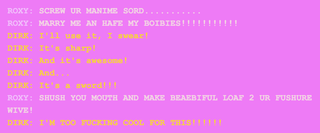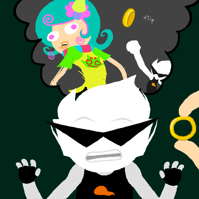 [S] Flip. is super cool. oh my god. the scratched disc... how they keep paralleling the kids session (facepalm combo, daves strife with bro, etc), how it keeps glitching... just peak. i like how terezi initially refuses to go along with vriskas roleplaying by going like mindfang... wait no, i mean vriska! but by the end she's fully devolved into the game.
